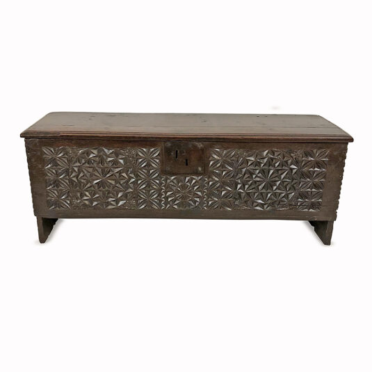 16TH CENT CARVED OAK COFFER / CHEST GEOMETRIC CARVED FRONT WITH PLANK ENDS WITH V CUT FEET 44 CM HIGH 116 CM WIDE 36 CM DEEP