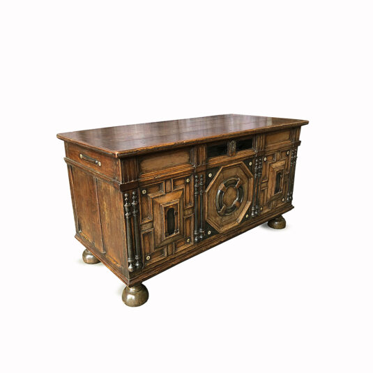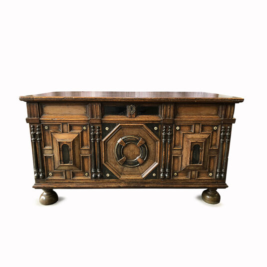 17TH CENT ANGLO - DUTCH OAK COFFER / CHEST WITH EBONY INLAID TRIPLE FIELDED GEOMETRIC PANELS ON BUN FEET 74 CM HIGH 135 CM WIDE 65 CM DEEP