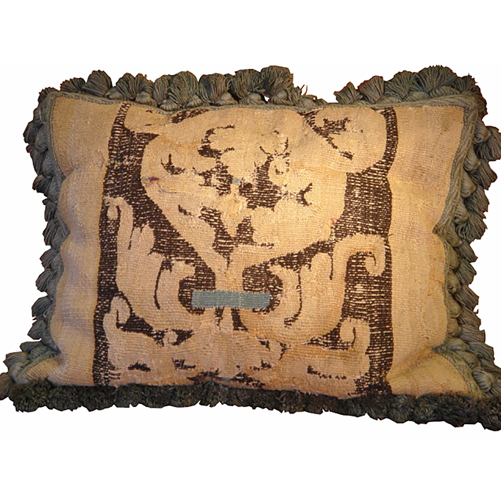 17TH CENT. BLACK AND BEIGE TAPESTRY CUSHION WITH BLUE FRINGE