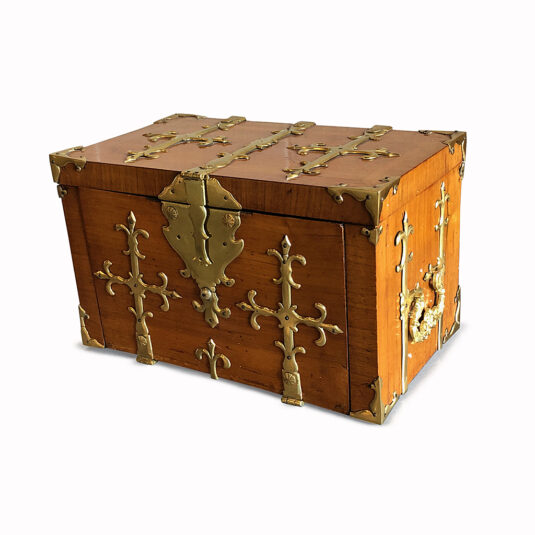17TH CENT FLEMISH STRONGBOX BRASS BOUND PALE KINGWOOD WITH ORNATE HANDLES 24 CM HIGH 39 CM WIDE 23 CM DEEP