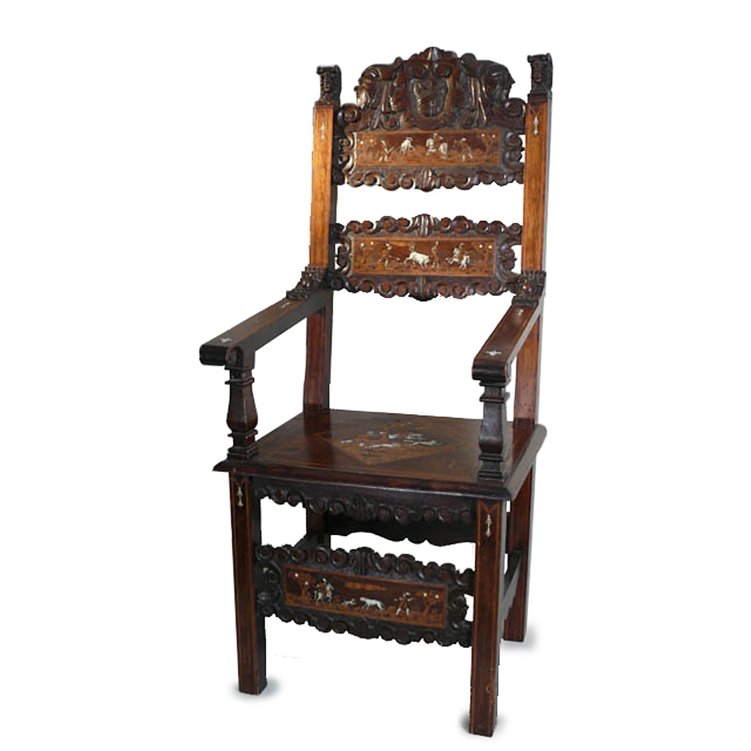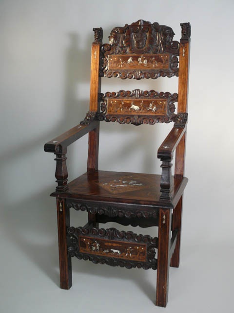 17TH CENT. FLORENTINE CARVED AND IVORY INLAID (HUNTING SCENE) HIGH BACK WALNUT ARM CHAIR 138 CM HIGH 59 CM WIDE 63 CM DEEP (X4) *APHA LICENSE FEE APPLIES*