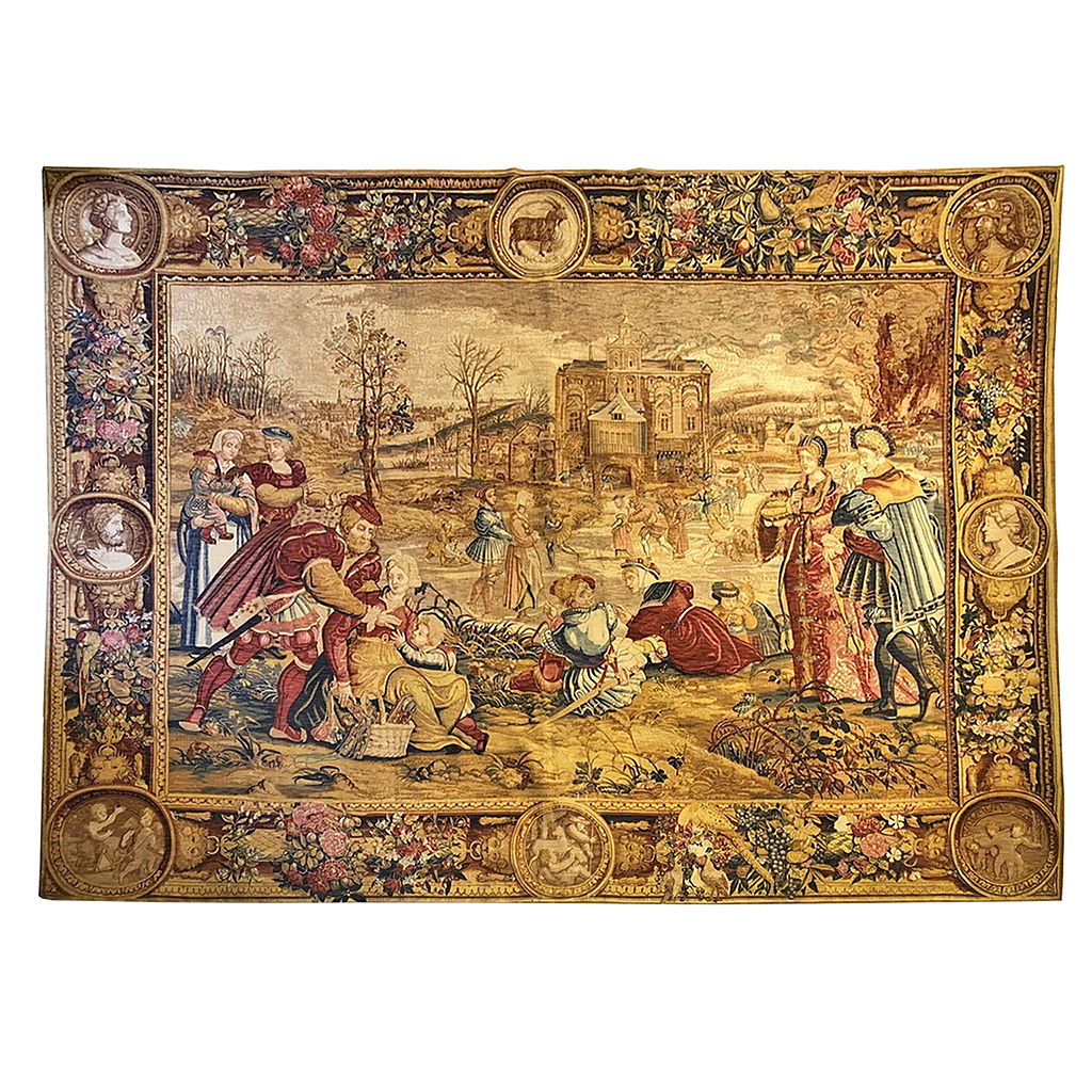 17TH CENT. GOBLINS STYLE TAPESTRY DECEMBER SKATING ON A LAKE SCENE WITH ORNATE CARTOUCHE BORDERV 7'7 HIGH 8'9 WIDE 231 CM X 267 CM