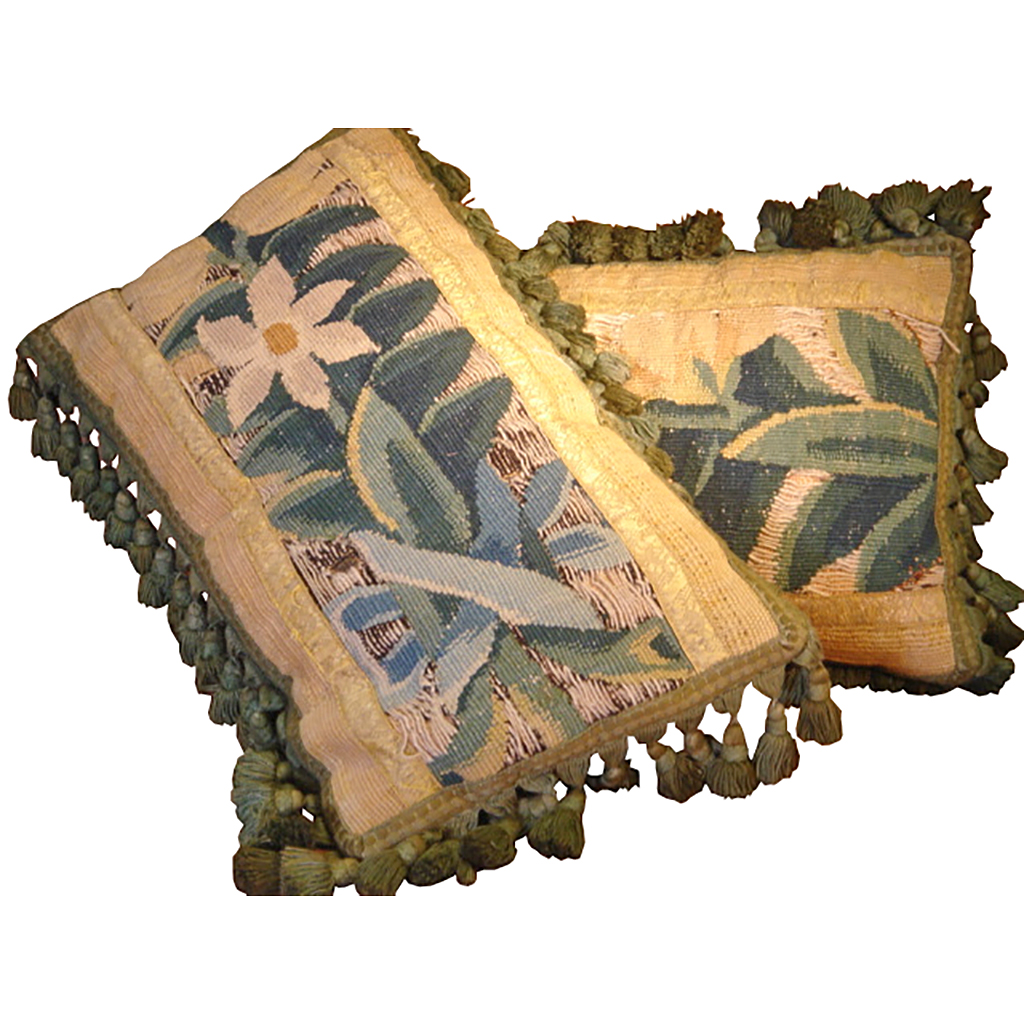 17TH CENT GREEN BRUSSELS TAPESTRY CUSHION OBLONG WITH GOLD BRAID AND GREEN FRINGED ENDS (X3)