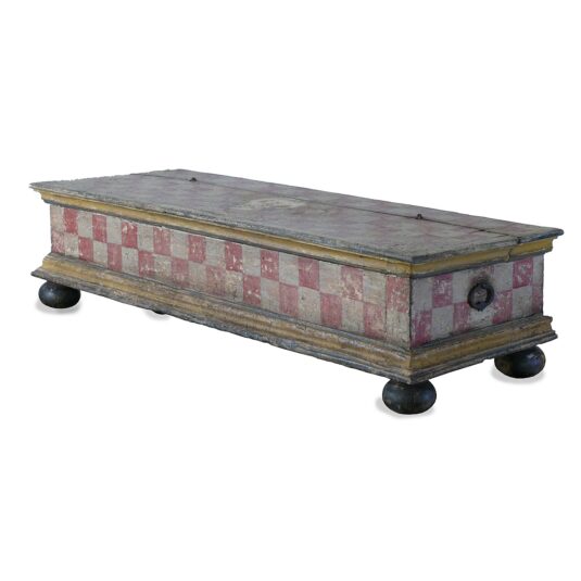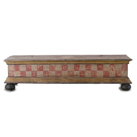 17TH CENT ITALIAN / SIENA LONG BOX / CASKET ORIGINAL RED AND WHITE CHECK PAINTED ON BUN FEET 24 CM HIGH 94 CM LONG 34 CM WIDE