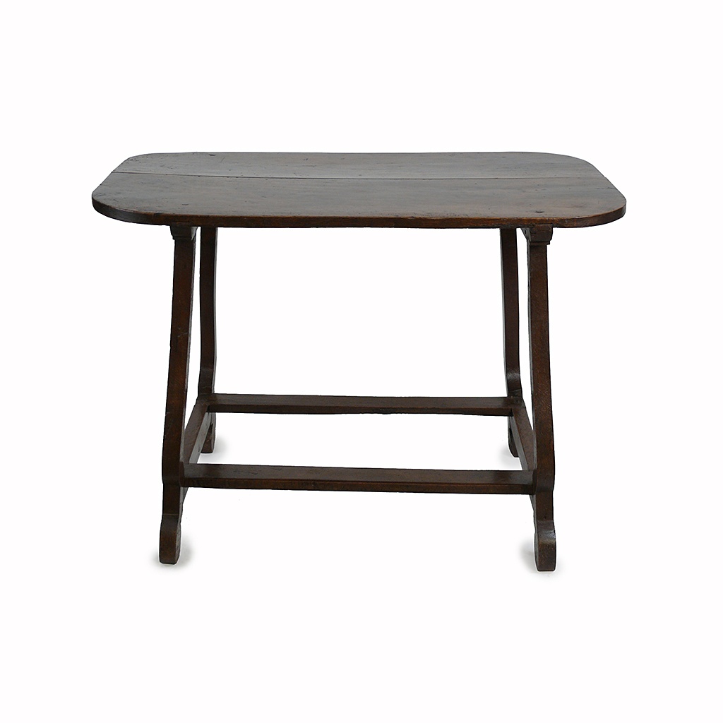 17TH CENT SIMPLE SPANISH OAK TABLE WITH LYRE LEGS AND TWIN STRETCHERS THE TOP HAVING ROUNDED CORNERS 79 CM HIGH 103 CM LONG 69 CM DEEP
