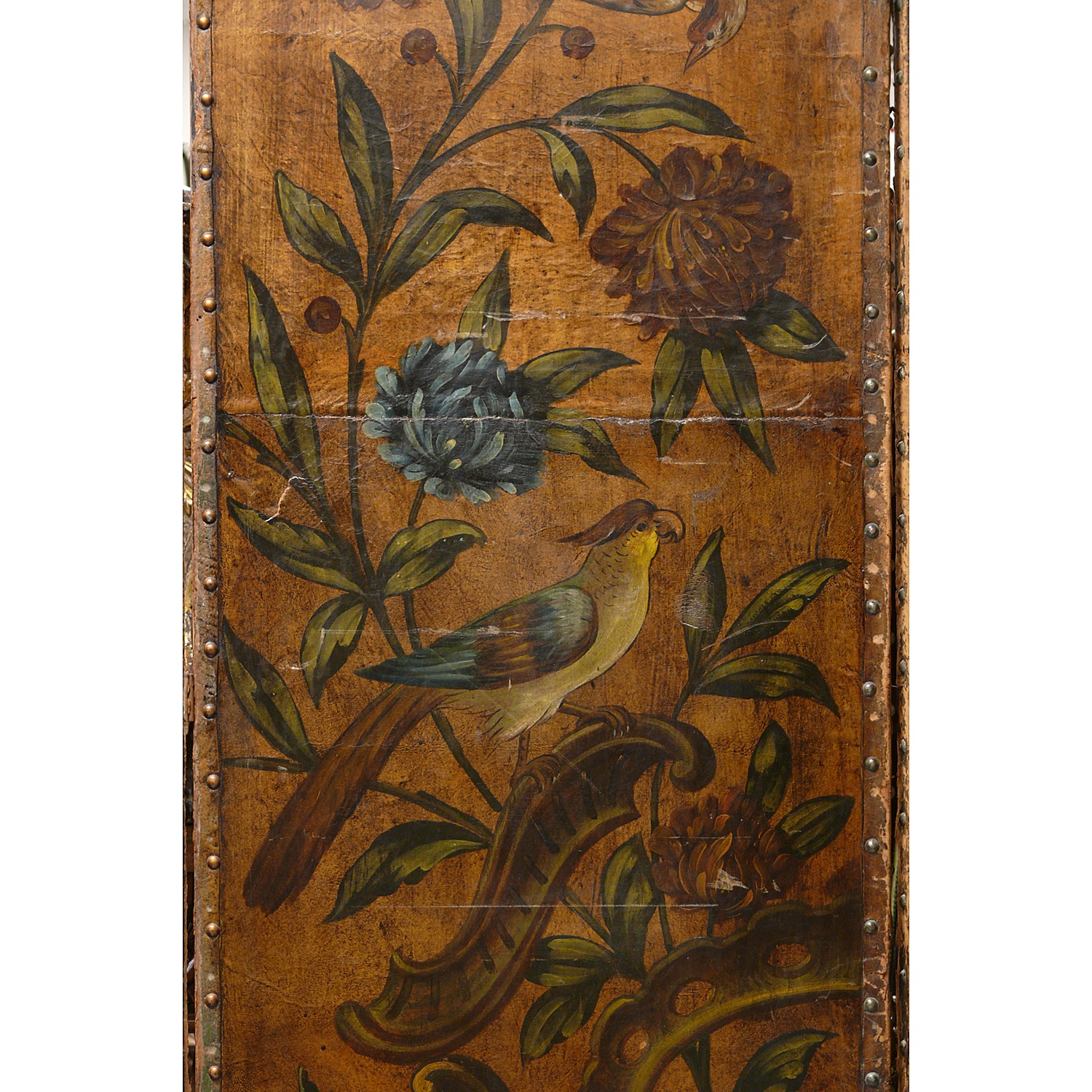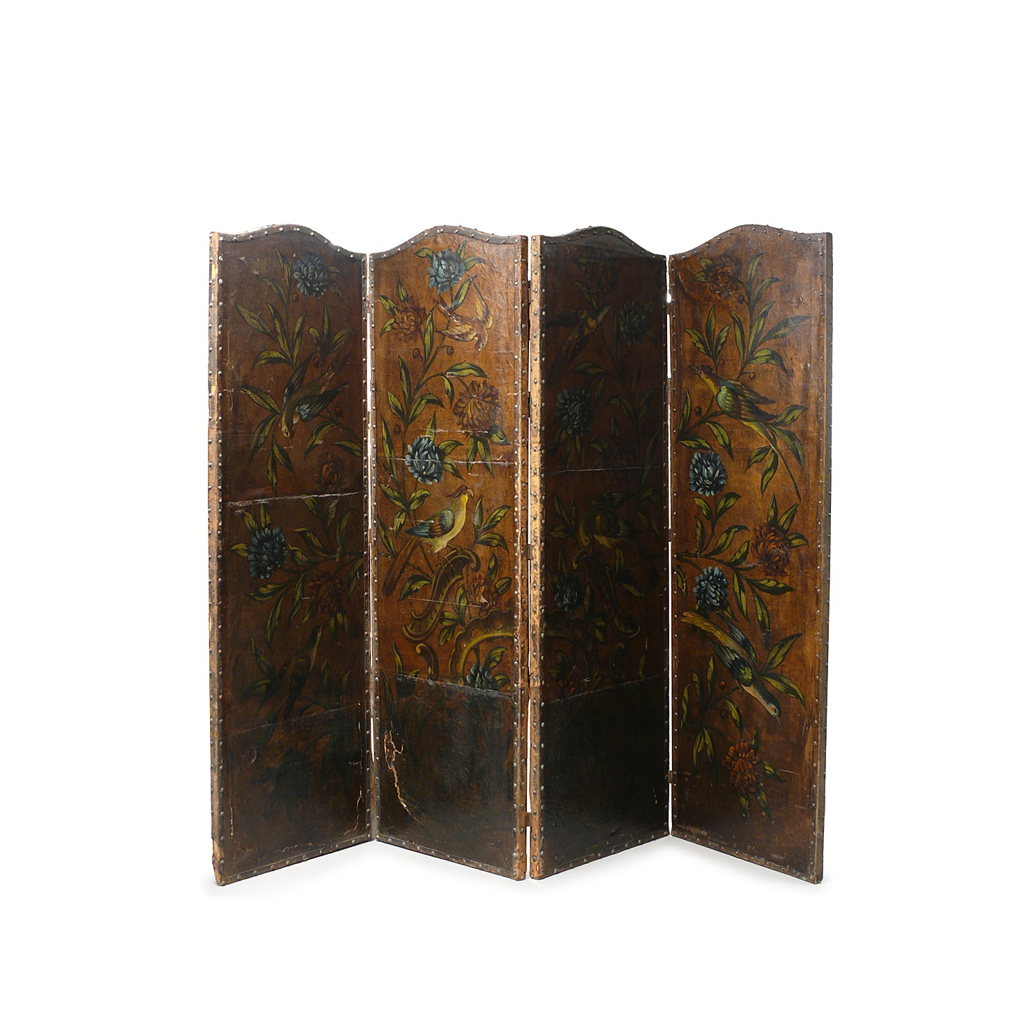 17TH CENT. SPANISH LEATHER SCREEN FOUR LEAF POLYCHROME PAINTED OF BIRDS AND BLUE FLOWERS 6' HIGH 183 CM