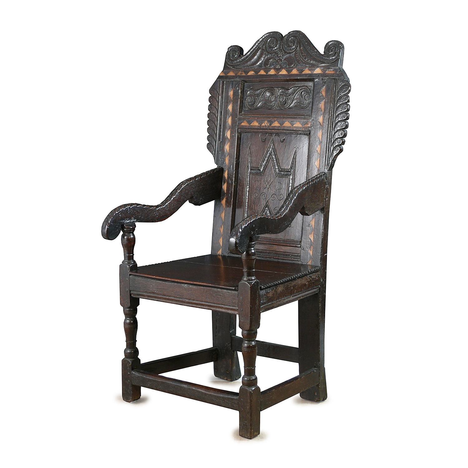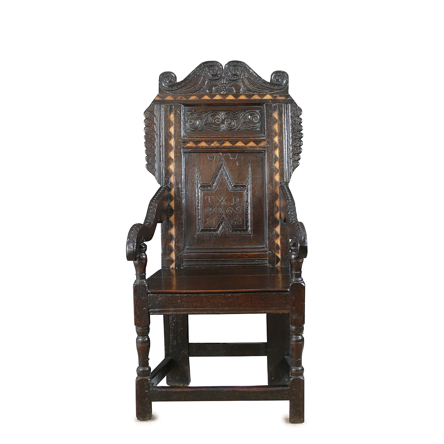 17TH CENT YORKSHIRE WAINSCOT ARM CHAIR CARVED AOK WITH DOG TOOTH INLAY INITIALED TWD 1560 70 CM HIGH 108 CM WIDE 51 CM DEEP