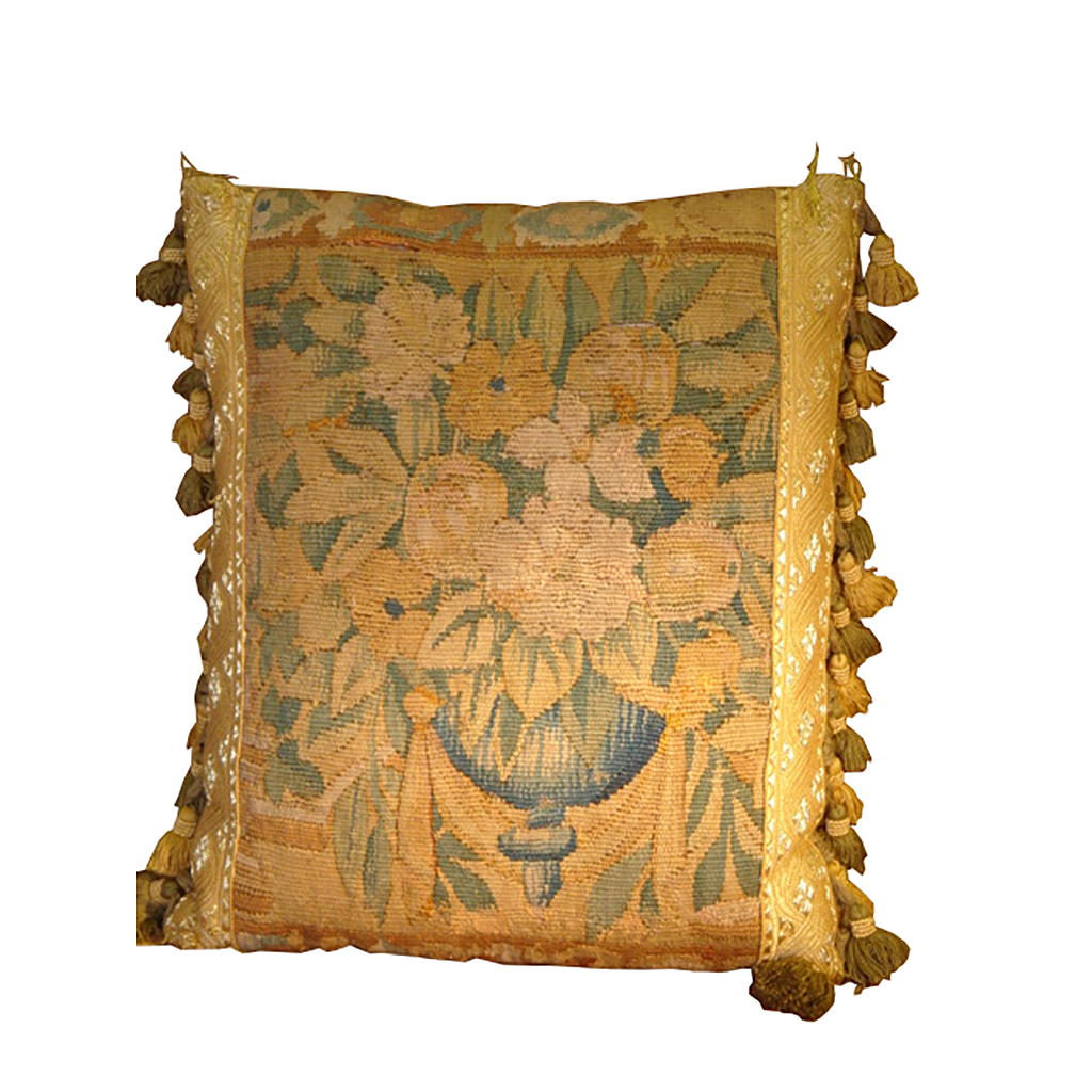 17TH CENTURY BRUSSELS TAPESTRY CUSHION WITH HEAVY GOLD BRAID AND BOBBLE FRINGED ENDS (X5)
