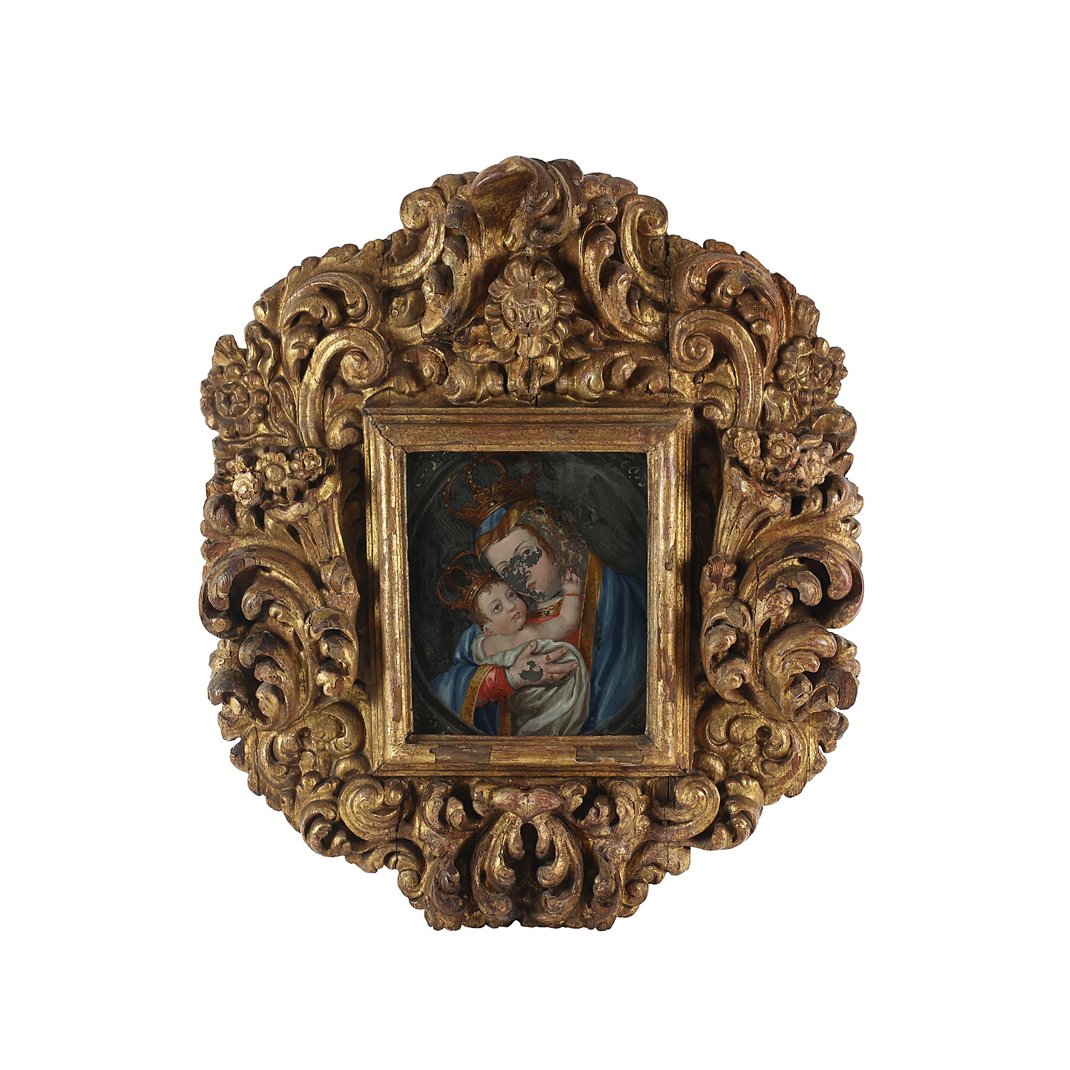 17TH CENTURY ITALIAN PAINTING ON GLASS MADONNA AND CHILD IN LARGE ORNATE CARVED AND GILDED FRAME 28/iH