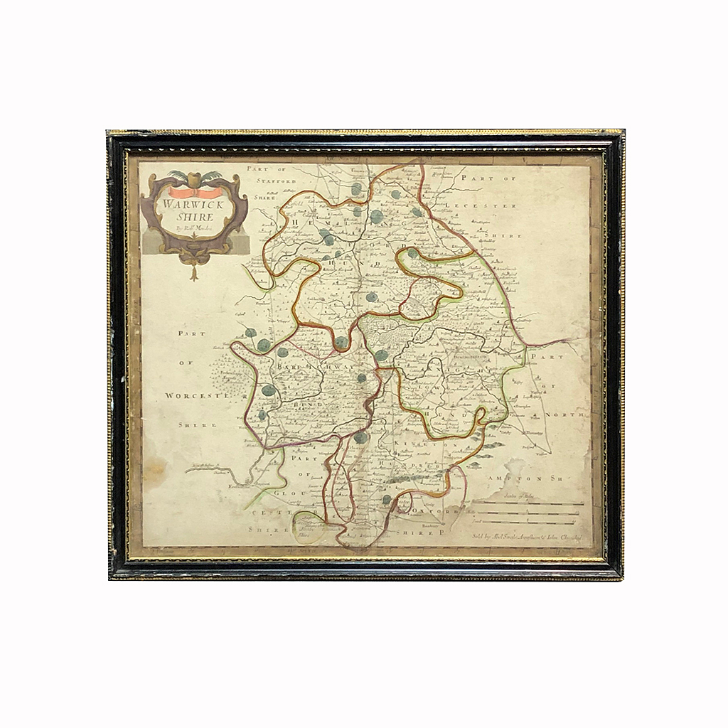 17THC COLOUR PRINT MAP OF WARWICKSHIRE BY ROBERT MORDEN IN A BLACK AND GOLD FRAME 15/i X 17/i