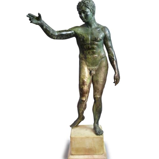 18TH CENT. BRONZE STATUE OF HERMES ON A WHITE MARBLE BASE RIGHT ARM OUT-STRETCHED AFTER PRAXITELES 71 CM HIGH 37 CM WIDE 18 CM DEEP