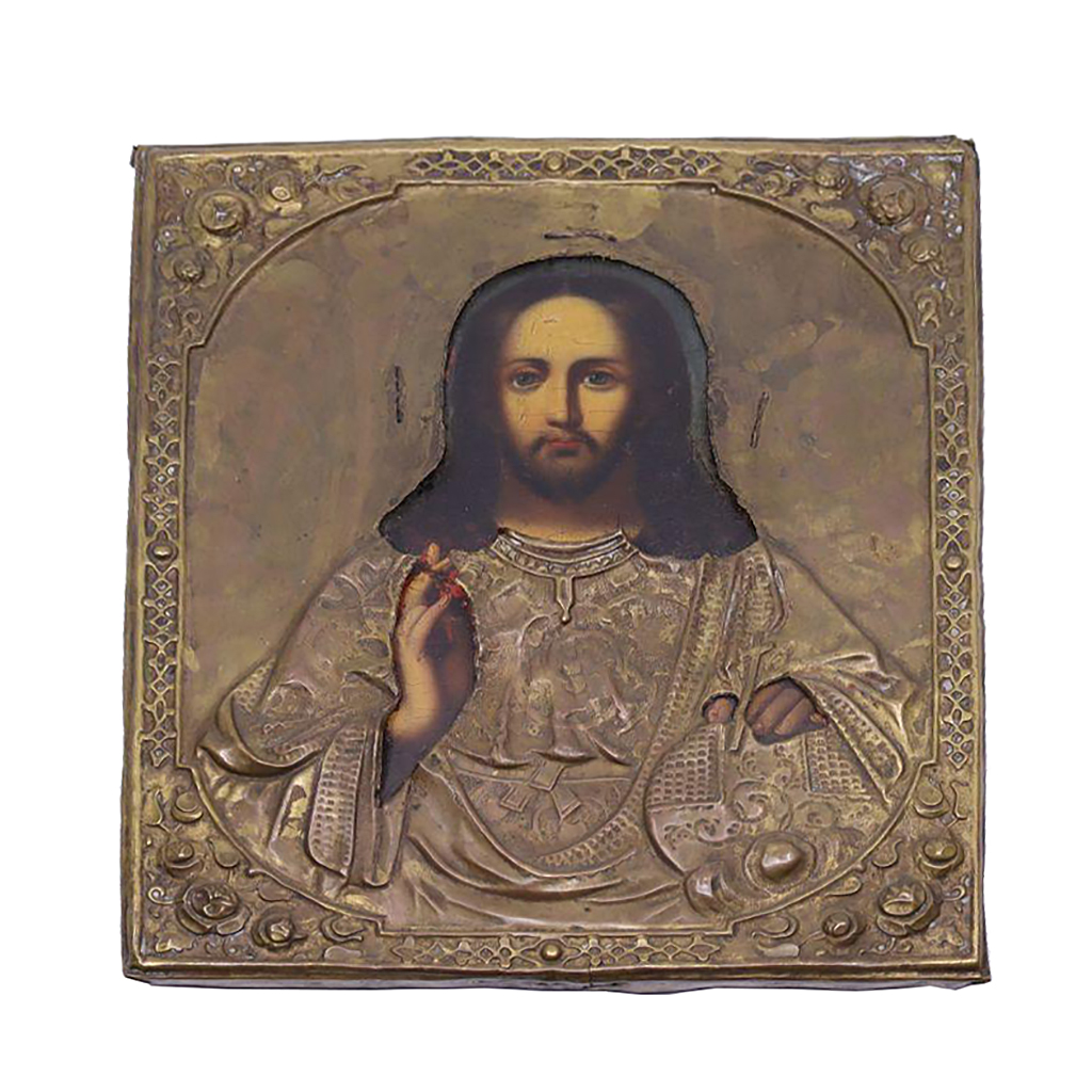 18TH CENT ICON CHRIST PANTOCRATOR WITH A GILT METAL OKLAD 26 CM X 31 CM