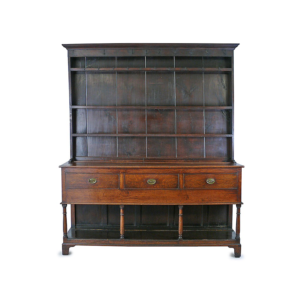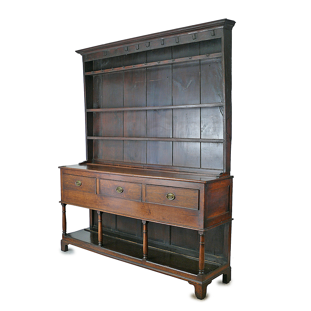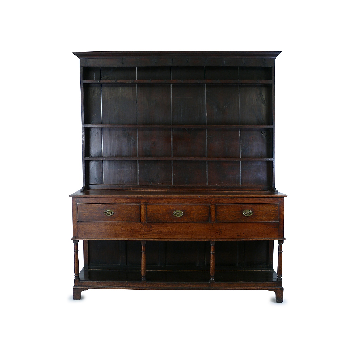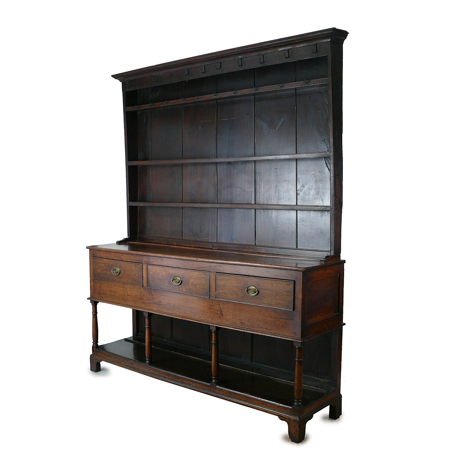 18TH CENT OAK TWO PART DRESSER WITH THREE DRAWERS AND LOWER POT SHELF 179 CM HIGH 216 CM WIDE 44 CM DEEP