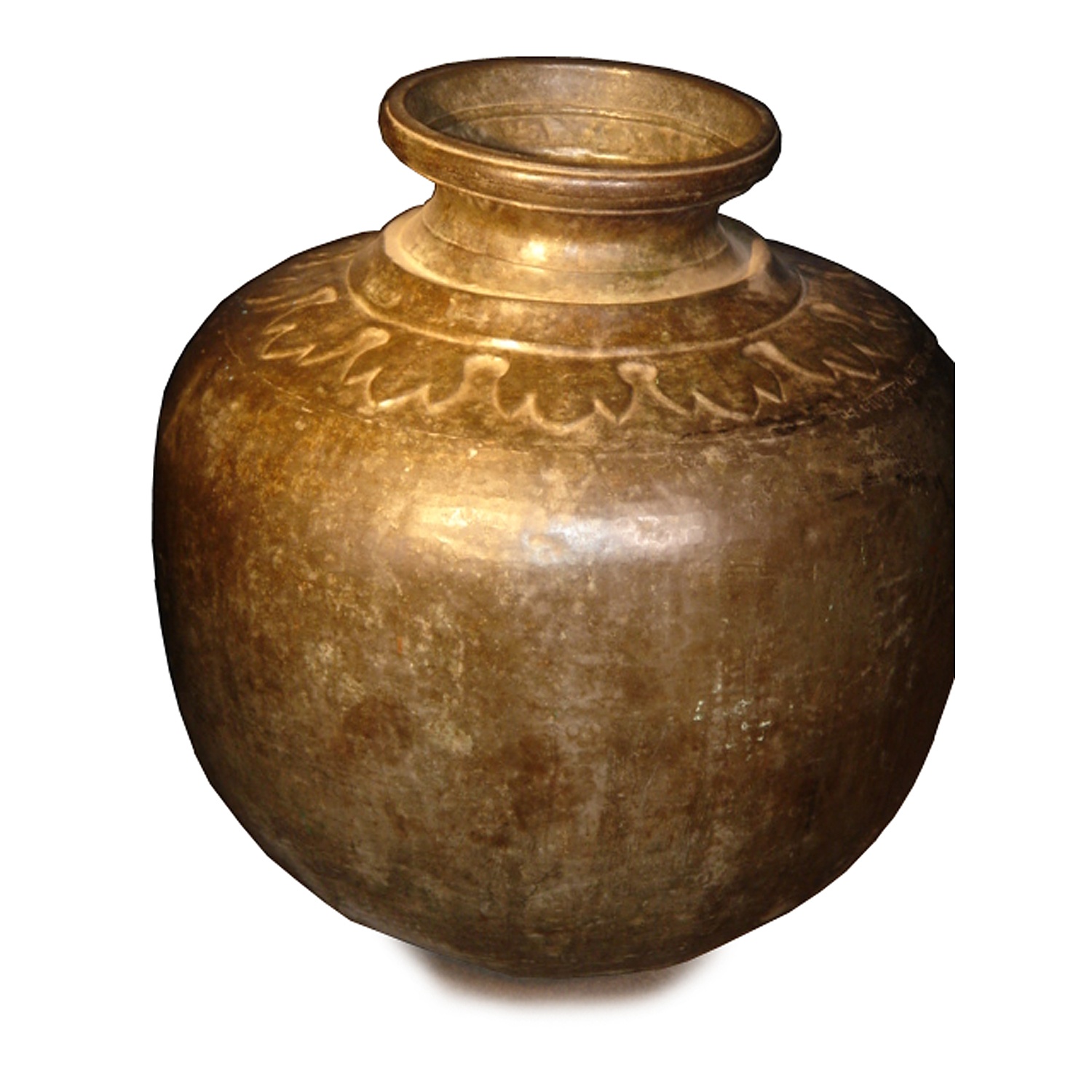 18TH CENTURY BRONZE FLASK SHAPE URN / JARDINIER WITH EMBOSSED STYLISED LEAF PATTERN TOP 2'2/i HIGH