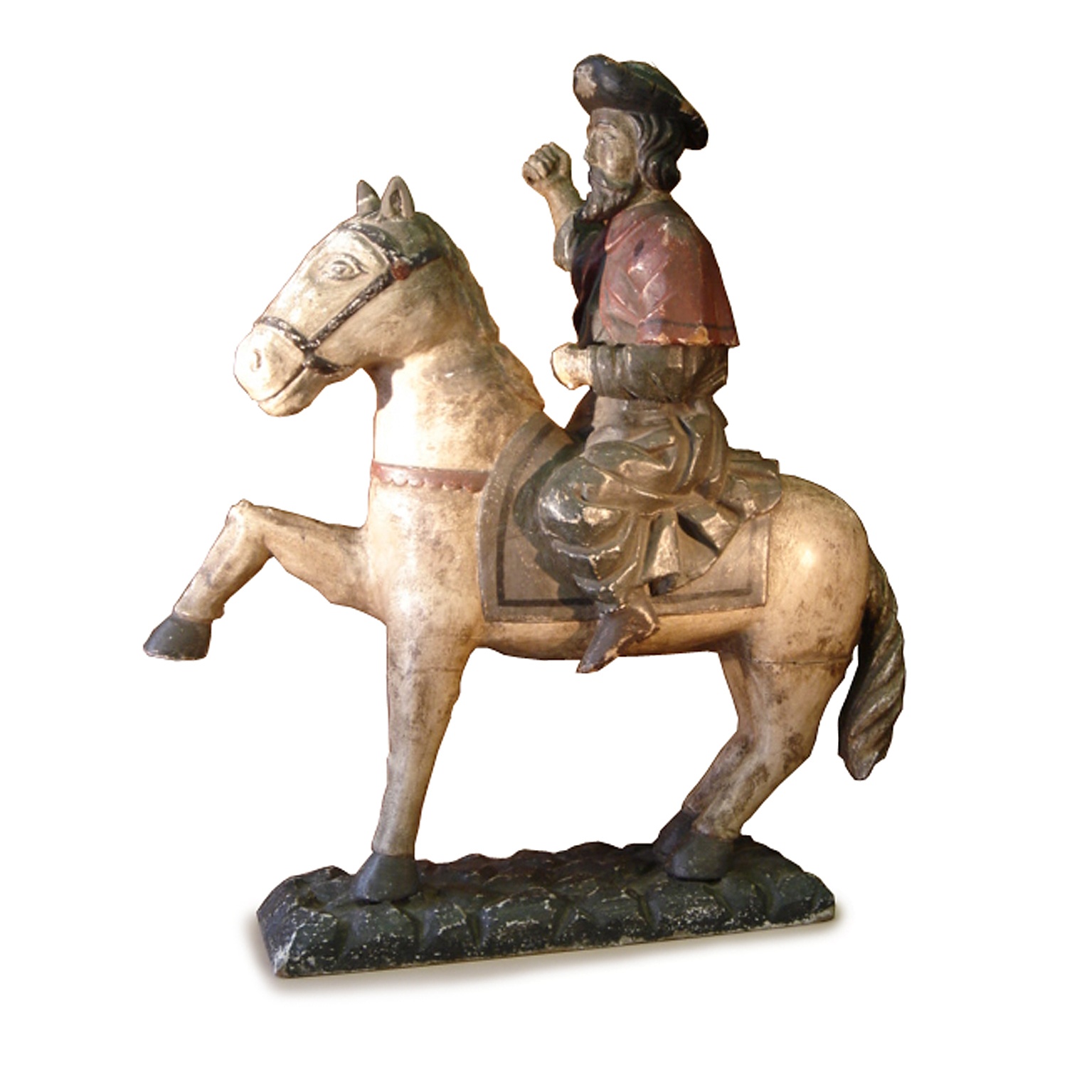 18TH CENTURY CARVED AND PAINTED SPANISH EQUESTRIAN FIGURE SHELL ON HAT SAINT JACOB 76 CM HIGH 66 CM WIDE 19 CM DEEP