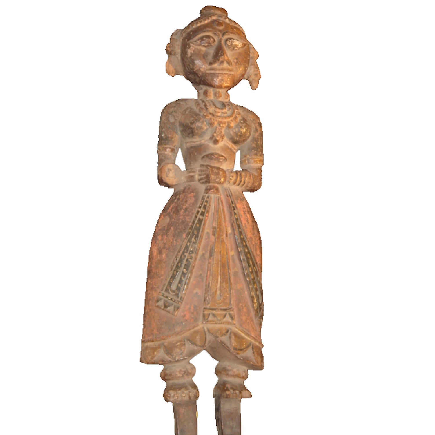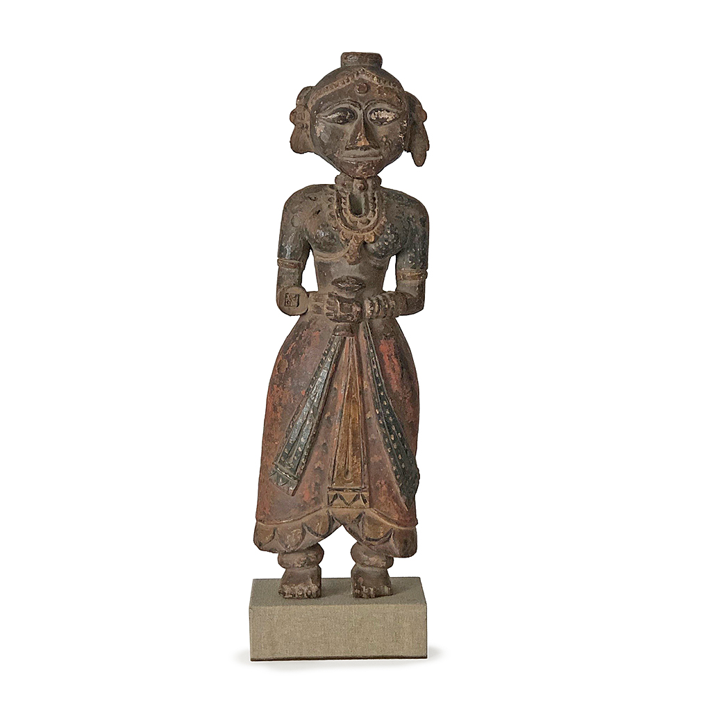 18TH CENTURY INDIAN CARVED AND PAINTED FEMALE FIGURE ON A CANVAS BASE 52 CM HIGH 15 CM WIDE 10 CM DEEP INC. BASE