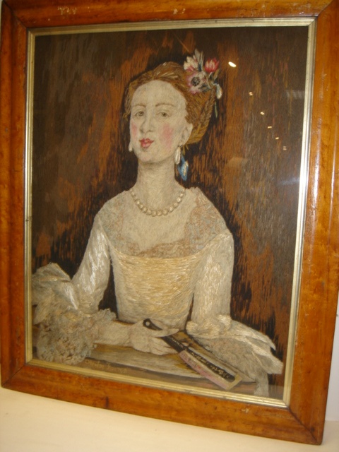 18TH CENTURY NEEDLEWORK PORTRAIT OF A LADY DATED 1758 IN A 2/i MAPLE FRAME 24/i X 19/i