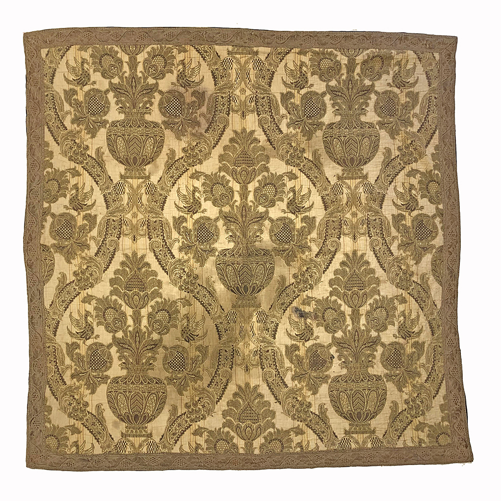 18TH CENTURY WOVEN BEIGE AND BROWN TABLECLOTH WITH GOLD BRAID EDGE - 3'8/i X 3'10/i