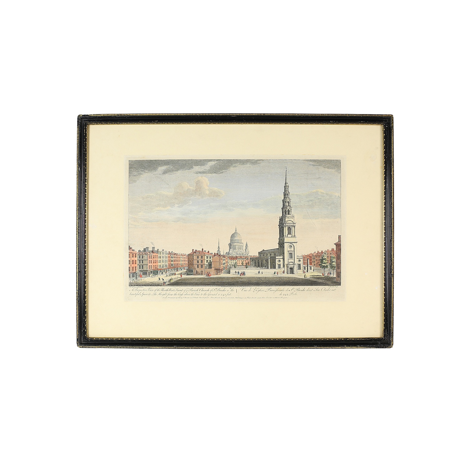 18THC COLOUR PRINT LONDON VIEW ST BRIDE'S AND ST PAUL'S IN A BLACK AND GOLD FRAME 16/i X 22/i
