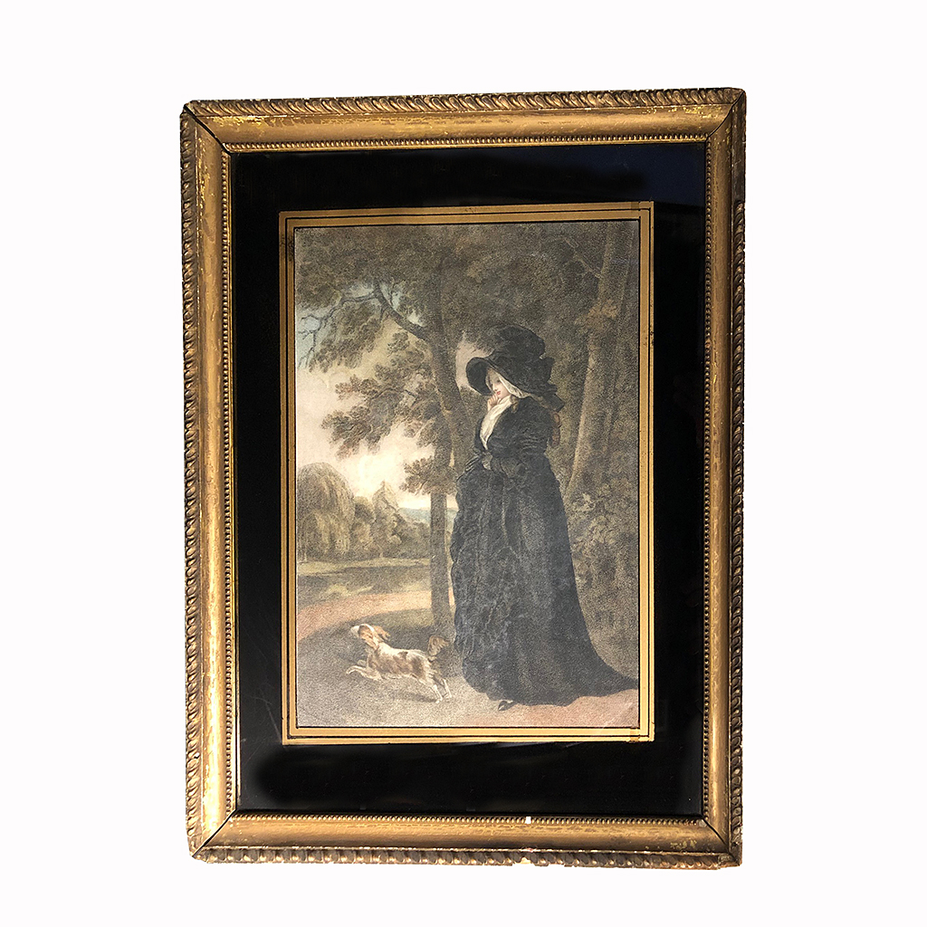 18THC COLOURED FRENCH PRINT LADY WEARING BLACK WALKING HER DOG IN A GILT HOLLOW FRAME WITH BLACK AND GOLD GLASS MOUNT 18/i X 15/i