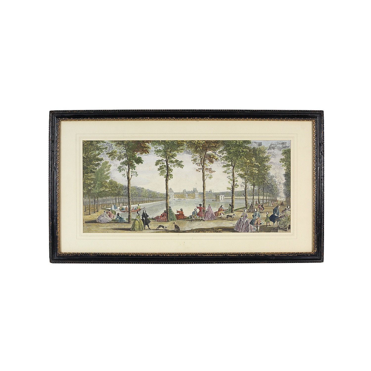 18THC FRENCH COLOUR PRINT FORMAL GARDENS AND FIGURES IN A BLACK AND GOLD FRAME 11/i X 21/i