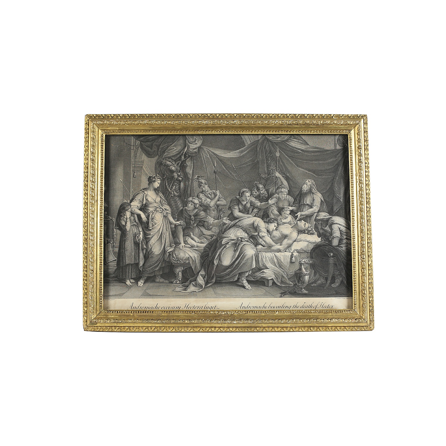 18THC FRENCH PRINT CLASSICAL SCENE ANDROMACHE AND THE DEATH OF HECTOR IN A CARVED GILT REVERSE FRAME 18/i X 23/i