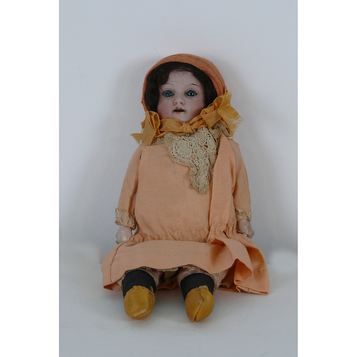 1920S BISQUE HEAD DOLL IN PEACH DRESS AND MATCHING CLOCHE HAT 27 CM HIGH