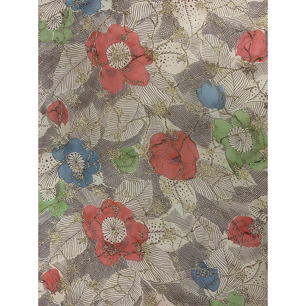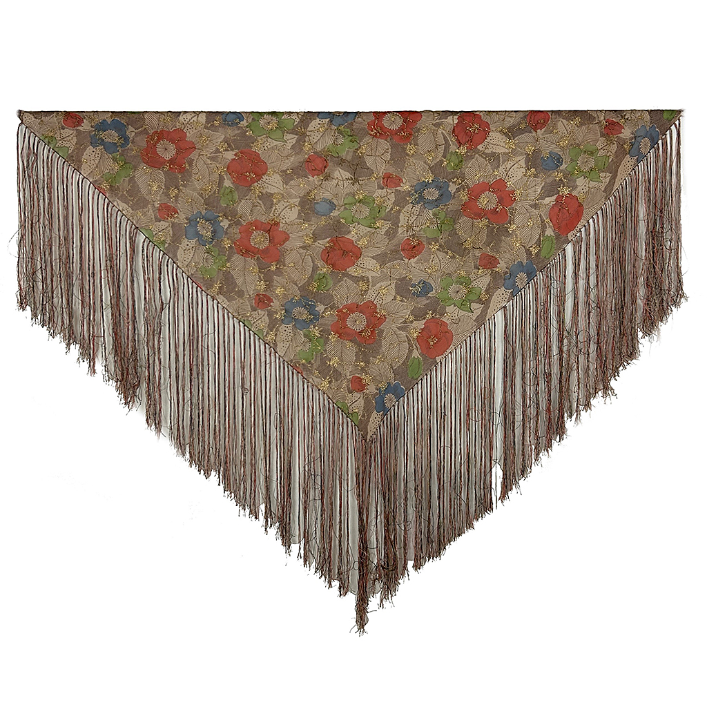 1920's RECTANGULAR PRINTTED CHIFFON SHAWL MULTICOLOURED FLORAL DESIGN WITH GOLD THREAD EMBROIDERY DETAILS AND LONG FRINGING