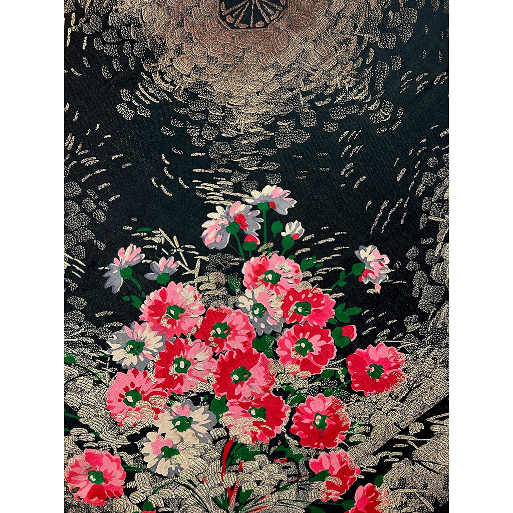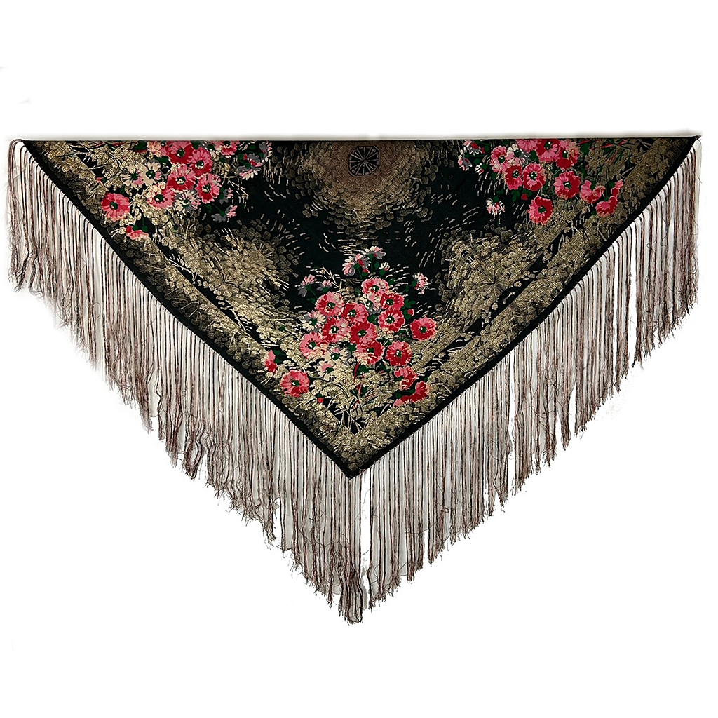 1920's SQUARE BLACK AND GOLD LAME SHAWL WITH LONG FRINGING AND GOLD LEAVES AND PINK FLOWERS DESIGN