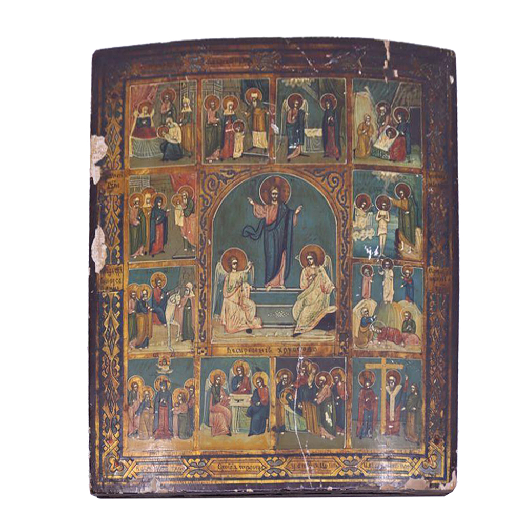 19TH CENT ICON OIL ON PANEL THE RESURRECTION AND TWELVE CARDINAL FEASTS 26 CM X 31 CM
