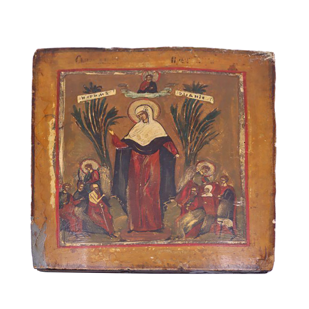 19TH CENT ICON OIL ON PANEL THE VIRGIN OF JOY TO THOSE WHO GRIEVE 31 CM X 27 CM
