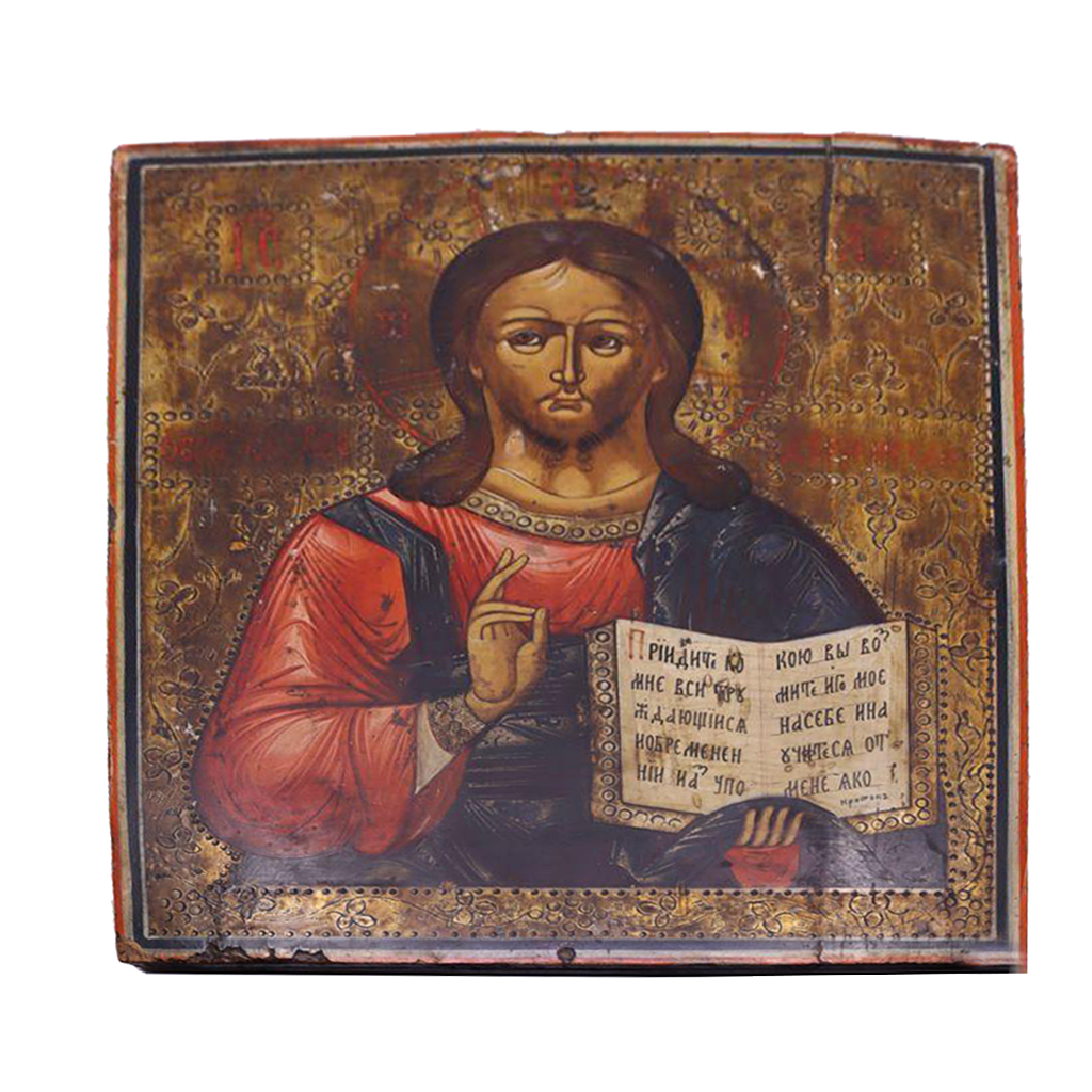 19TH CENT ICON PAINTING OIL ON PANEL CHRIST PANTOCRATOR 34 CM X 43 CM
