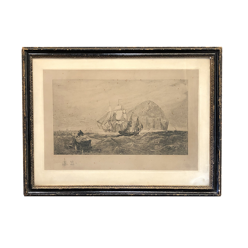 19TH CENT MARINE PRINT SAILING SHIPS IN ROUGH SEAS OF A ROCKY COAST IN A BLACK AND GOLD FRAME 20" X 28"