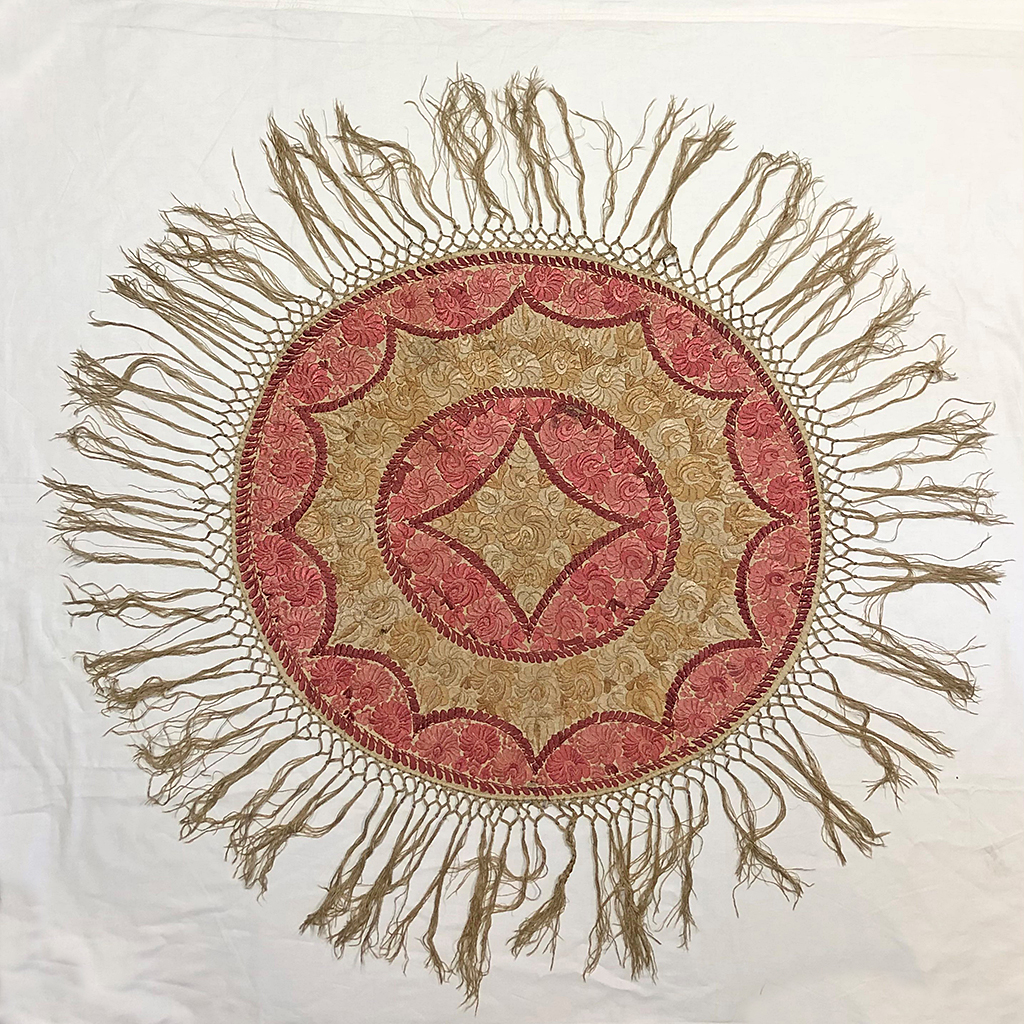 2'6 DIAM CIRCULAR PINK BEIGE EMBROIDERED TABLECLOTH W FRINGING
