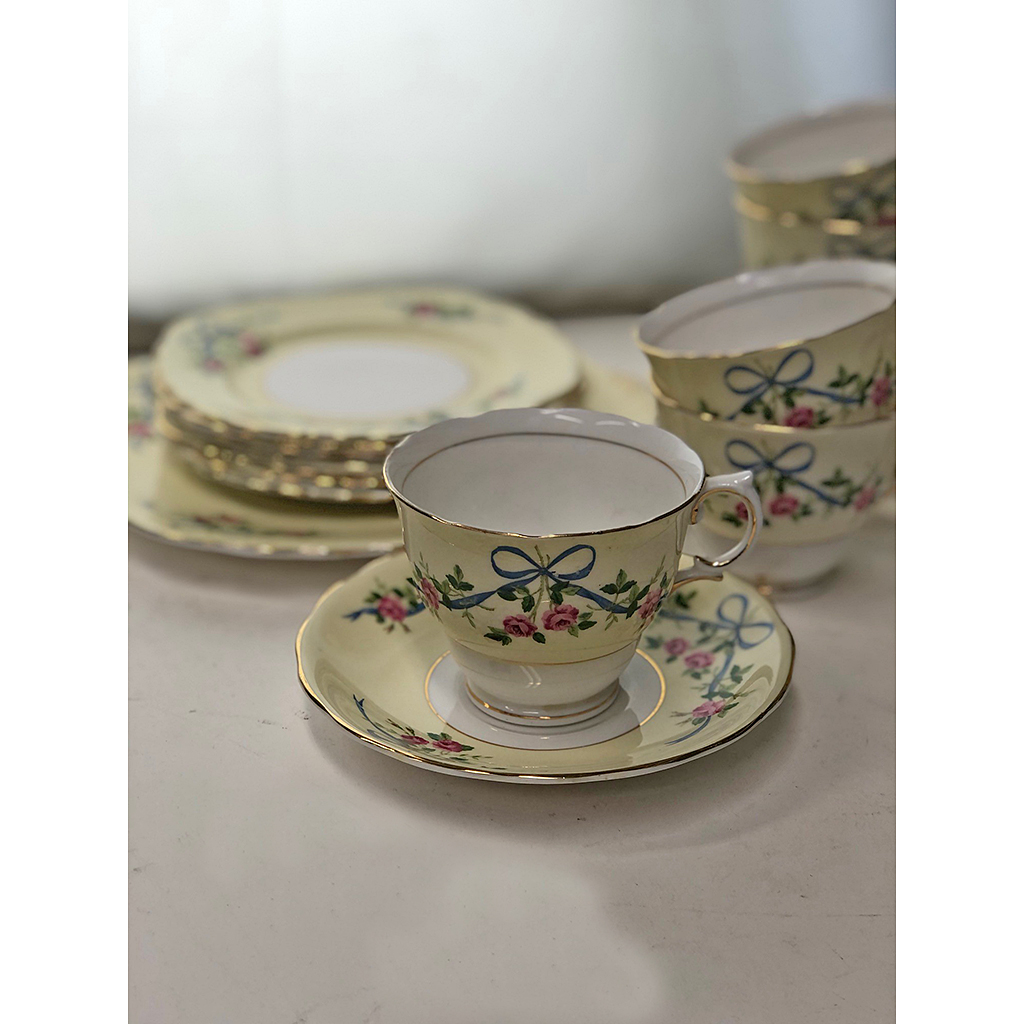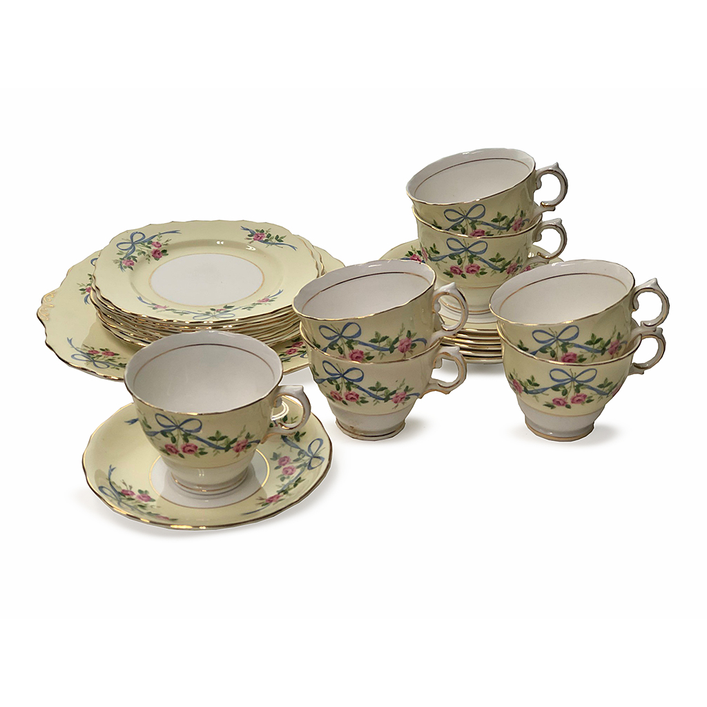 A BONE CHINA COLCLOUGH TEA SET INC. 7 CUPS AND SAUCERS 7 TEA PLATES AND 1 CAKE PLATE CREAM WITH PINK ROSE PATTERN