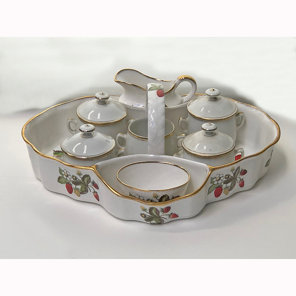 A ST GEORGE CHINA BREAKFAST CRUET SET STRAWBERRY PATTERN COMPRISING TRAY 5 PRESEVE POTS WITH FOUR LIDS CREAM JUG AND BUTTER DISH 31 CM LONG 26 CM DEEP