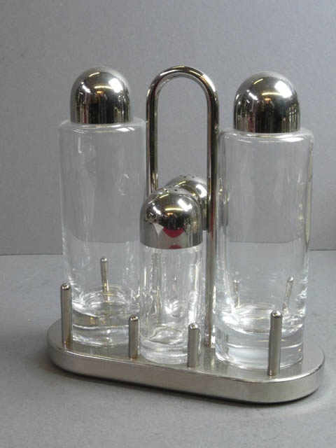 ALESSI CRUET SET OVAL CHROME STAND AND FOUR GLASS BOTTLES