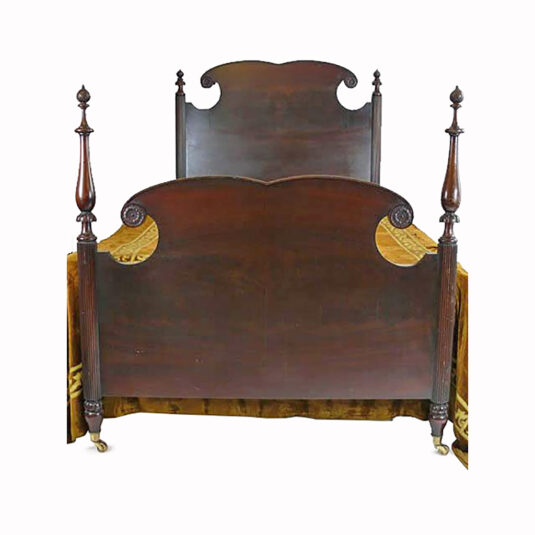 AMERICAN MAHOGANY DOUBLE BED TURNED AND FLUTED HALF POSTS COMPLETE WITH MATTRESS 4' WIDE
