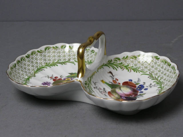 ANCAP ITALIAN GREEN FRUIT DECORATED PORCELAIN DOUBLE BON BON DISH WITH HANDLE