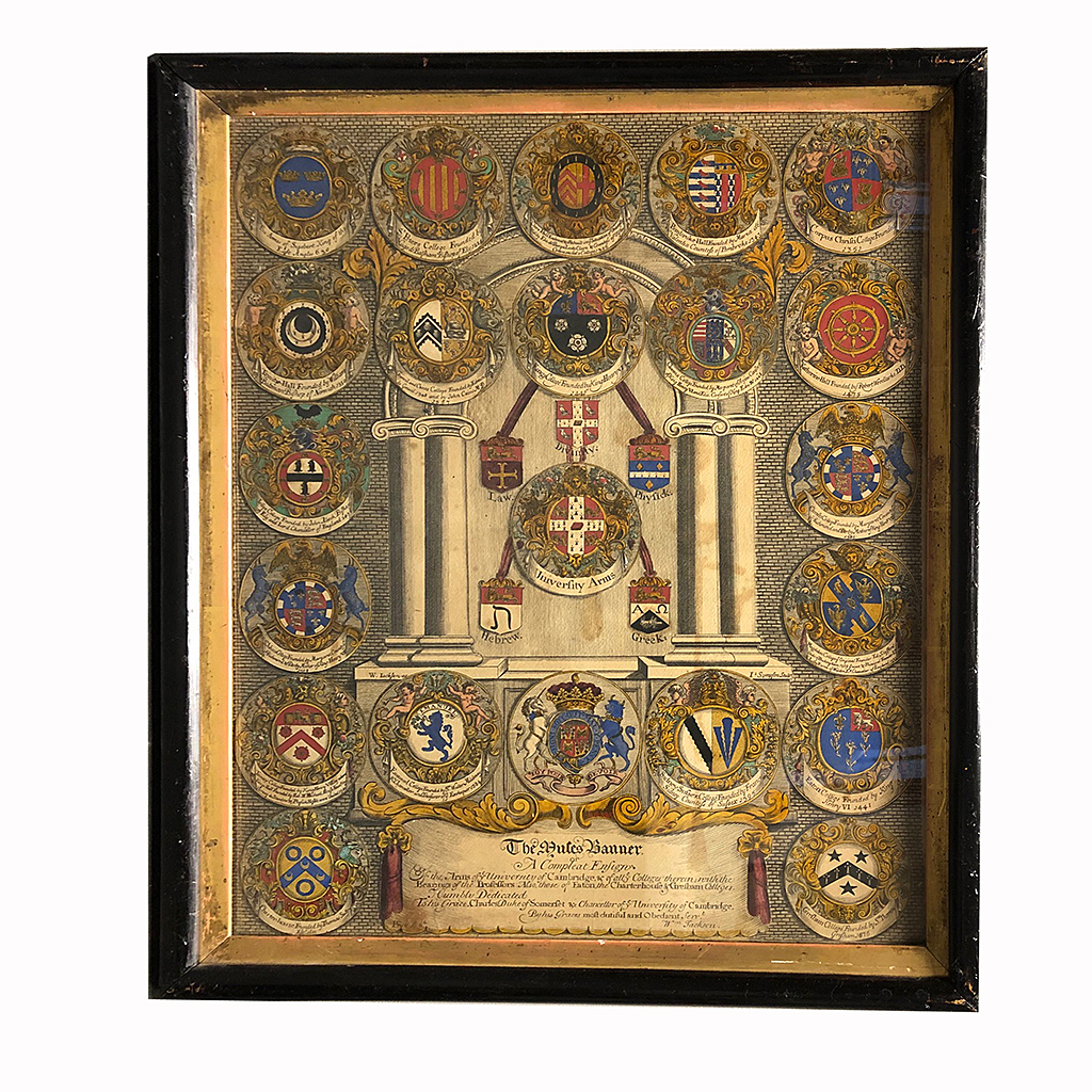 ANTIQUE COLOUR PRINT THE GULES OF CAMBRIDGE - COATS OF ARMS OF COLLEGES IN A BROWN CUSHION FRAME 20/i X 16/i