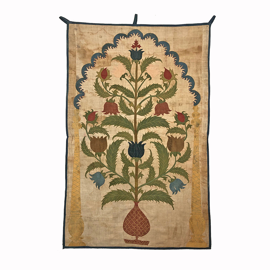 ANTIQUE INDIAN FLORAL APPLIQUE WALL PANEL VASE DESIGN WITH BLUE BORDER 5'6/i X 3'6/i