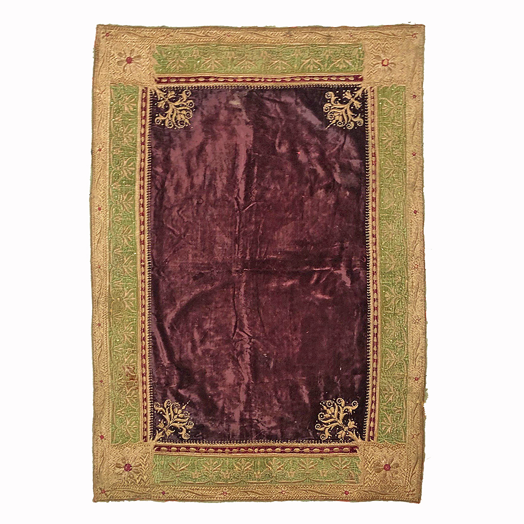 ANTIQUE INDIAN RECTANGULAR AUBERGINE VELVET CLOTH WITH OLIVE GREEN BORDER HEAVY GOLD EMBROIDERY 5' X 3'6/i