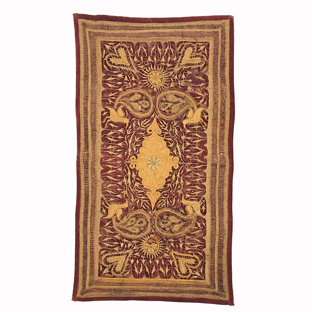 ANTIQUE INDIAN RECTANGULAR BURGUNDY VELVET CLOTH WITH HEAVY GOLD EMBROIDERY WITH CENTRAL MEDALION 5' X 2'8/i