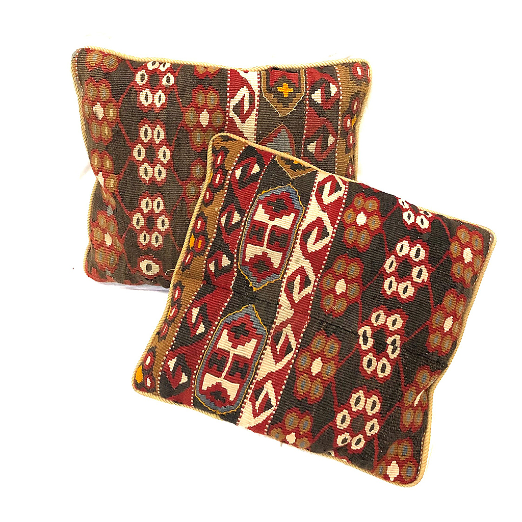 ANTIQUE KELIM / ETHNIC CUSHION WITH GEOMETRIC DESIGNS AND ROPE EDGE 39 CM X 36 CM