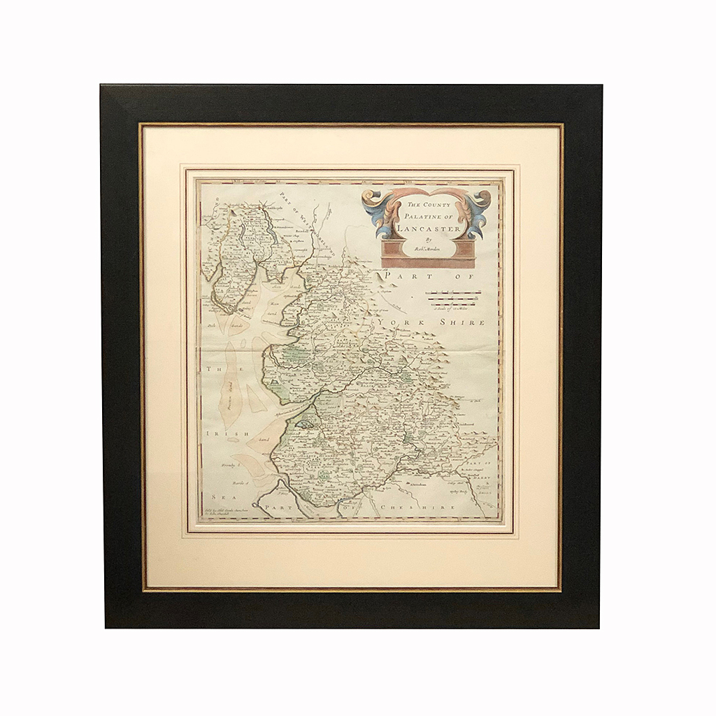 ANTIQUE MAP OF LANCASHIRE FROM CAMDEN'S BRITANNIA BY ROBERT MORDEN CIRCA 1722 IN A BLACK FRAME