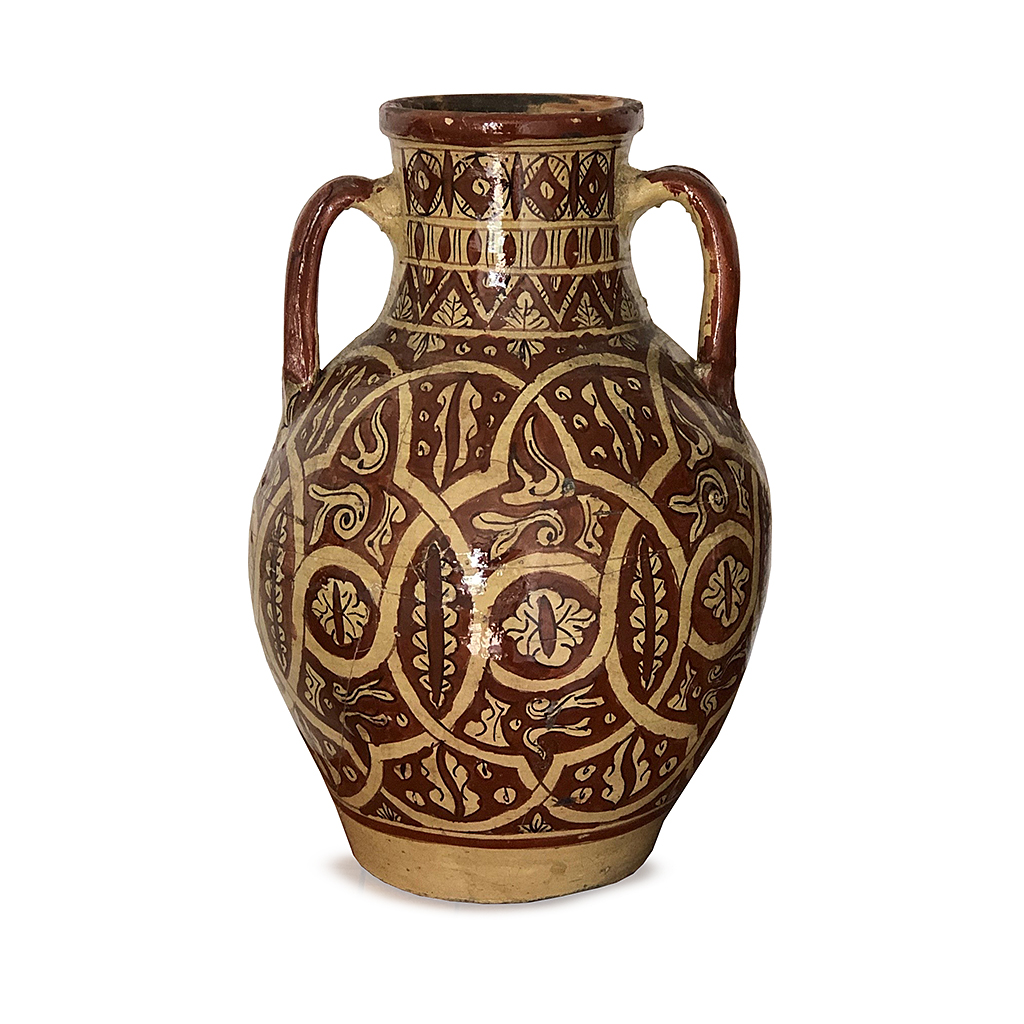 ANTIQUE MOORISH VASE BROWN AND CREAM WITH TWO LOOP HANDLE 43 CM HIGH 27 CM WIDE