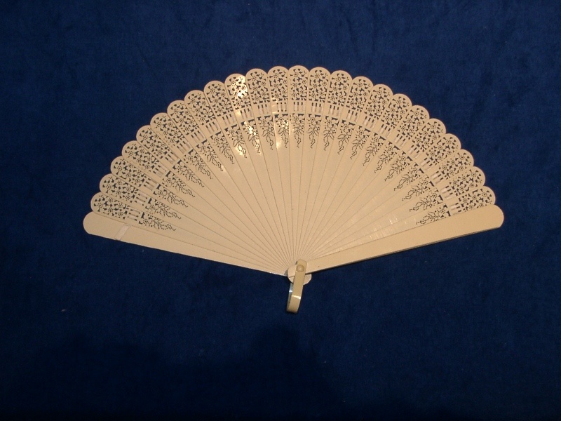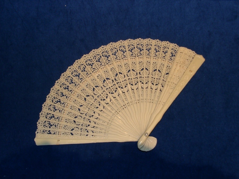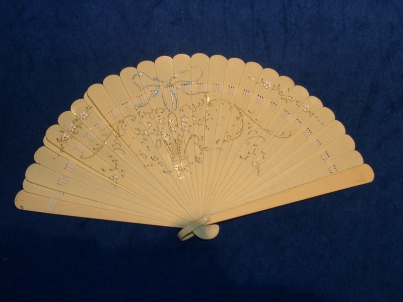 ANTIQUE ORIENTAL FAN CARVED BONE WITH PAINTED FEATHER TRIM IN GREEN RED AND BLUE 29 CM