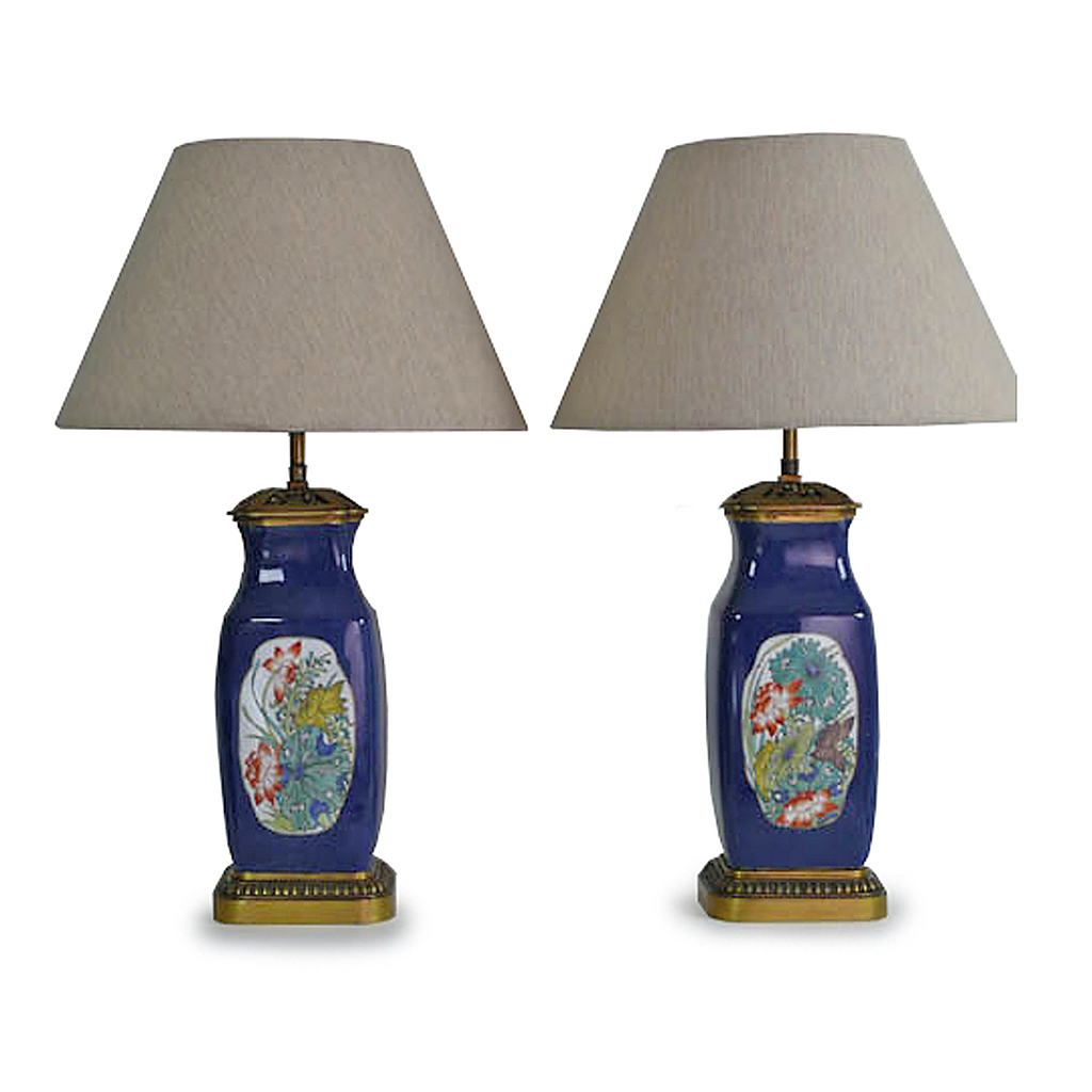 ANTIQUE TABLE LAMP FRENCH ORMOLU MOUNTED BLUE CHINESE SQUARE CERAMIC VASE WITH FLORAL PANEL 19TH CENT.15" HIGH 38 CM (X2) (MEDIUM SHADE LIGS10078 NOT INCLUDED)
