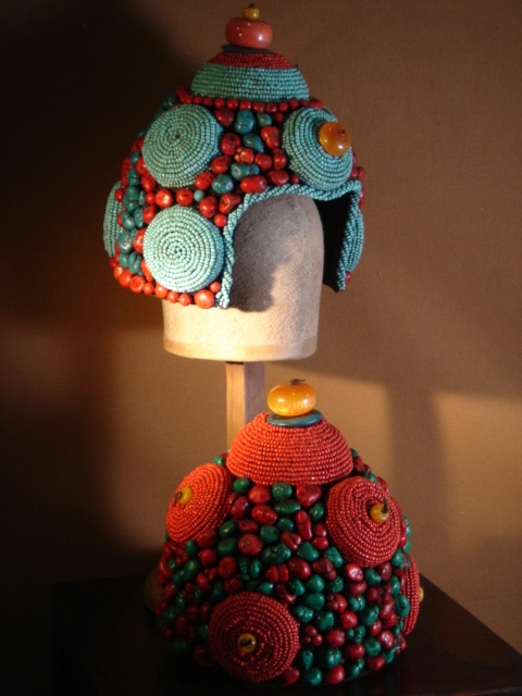ANTIQUE TIBETAN HEADDRESS CORAL AND TURQUOISE BEAD PLUS HARDSTONE DECORATION (X2)