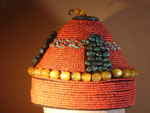 ANTIQUE TIBETAN HEADDRESS TURQUOISE AND AMBER BEAD DECORATION